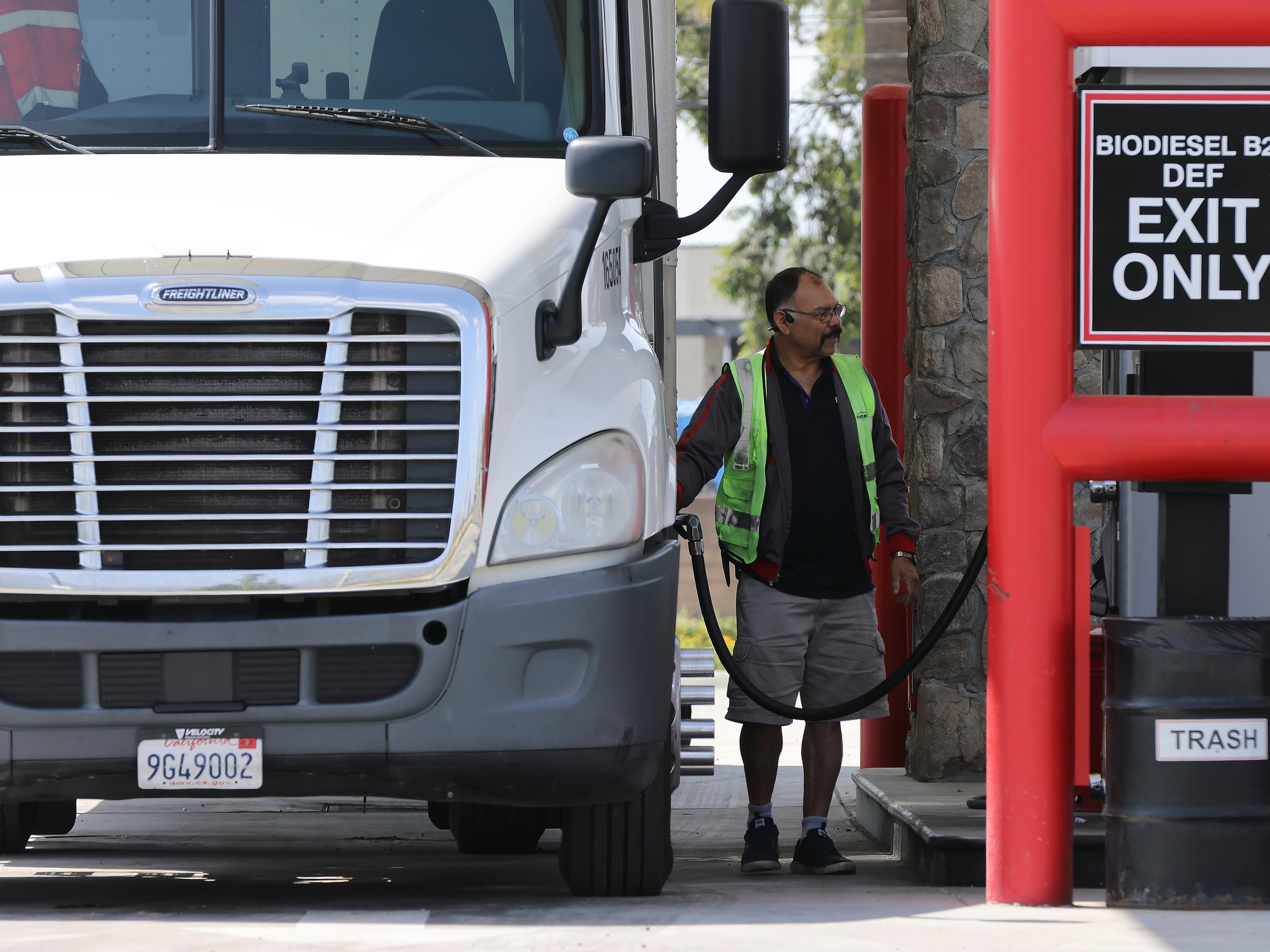 4月17日,一名司机在美国加利福尼亚州蒙罗维亚市一家加油站为卡车加油。