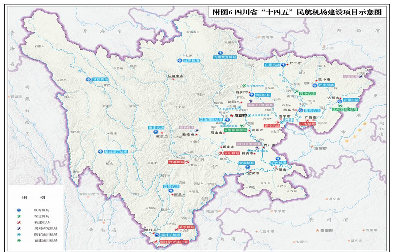 2022年,《“十四五”民用航空发展规划》出炉,其中不仅包括将在“十四五”期间新开工的乐山机场,遂宁、凉山会东、内江、广安四地的新民用运输机场也将开展前期工作。待这些机场均建成投运后,四川拥有民用运输机场的城市数量将进一步扩充至16座。