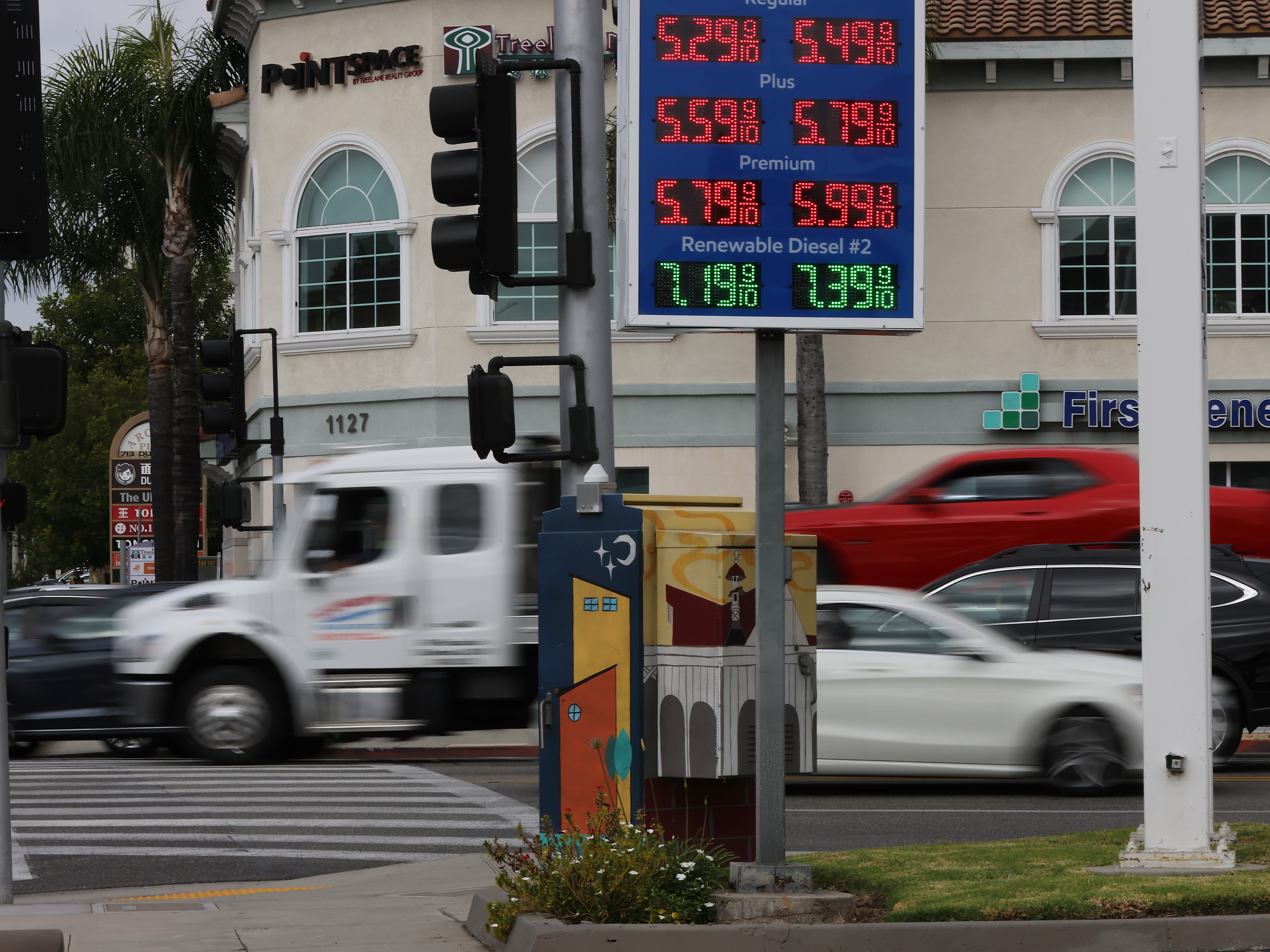 这是4月17日在美国加利福尼亚州阿卡迪亚市一家加油站拍摄的油价牌。