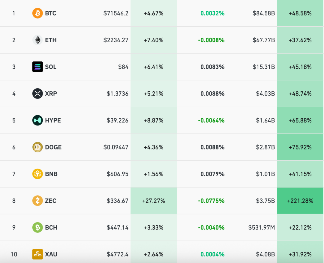 加密货币主要币种集体上涨,截至发稿,比特币涨至7.1万美元/枚,涨幅超4.6%,以太坊、SOL、XRP、狗狗币等均大幅上涨。