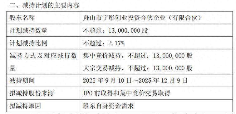 9月3日晚间,彤程新材(603650)公告称,股东舟山市宇彤创业投资合伙企业(以下简称“宇彤投资”)因自身资金需求,计划在2025年9月10日至2025年12月9日期间,通过集中竞价和/或大宗交易方式,合计减持不超过1300万股,约占公司总股本的2.17%。